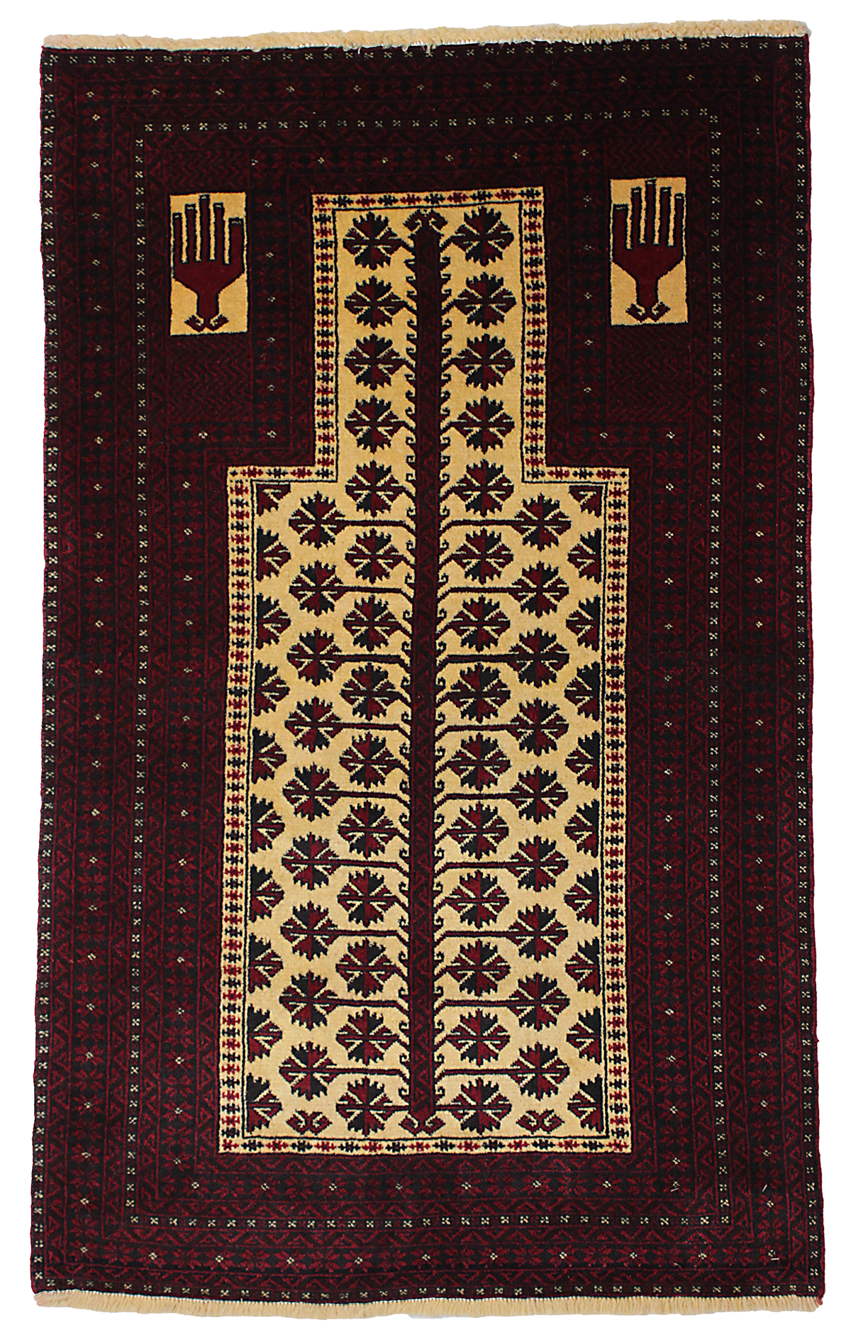■バルーチ産のペルシャ絨毯は、赤と黒のカラーが特徴的で渋い色合いです。文様もトライバルなものが多く、お部屋のアクセントにピッタリです。
